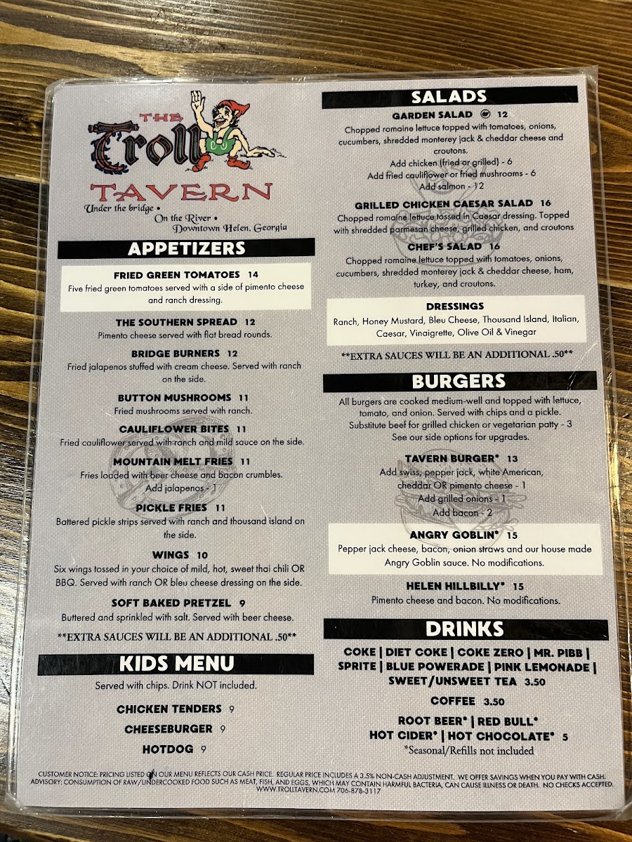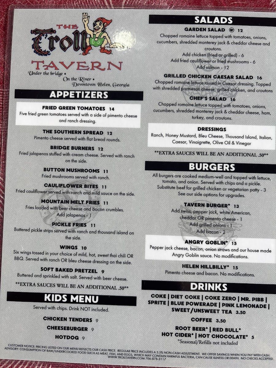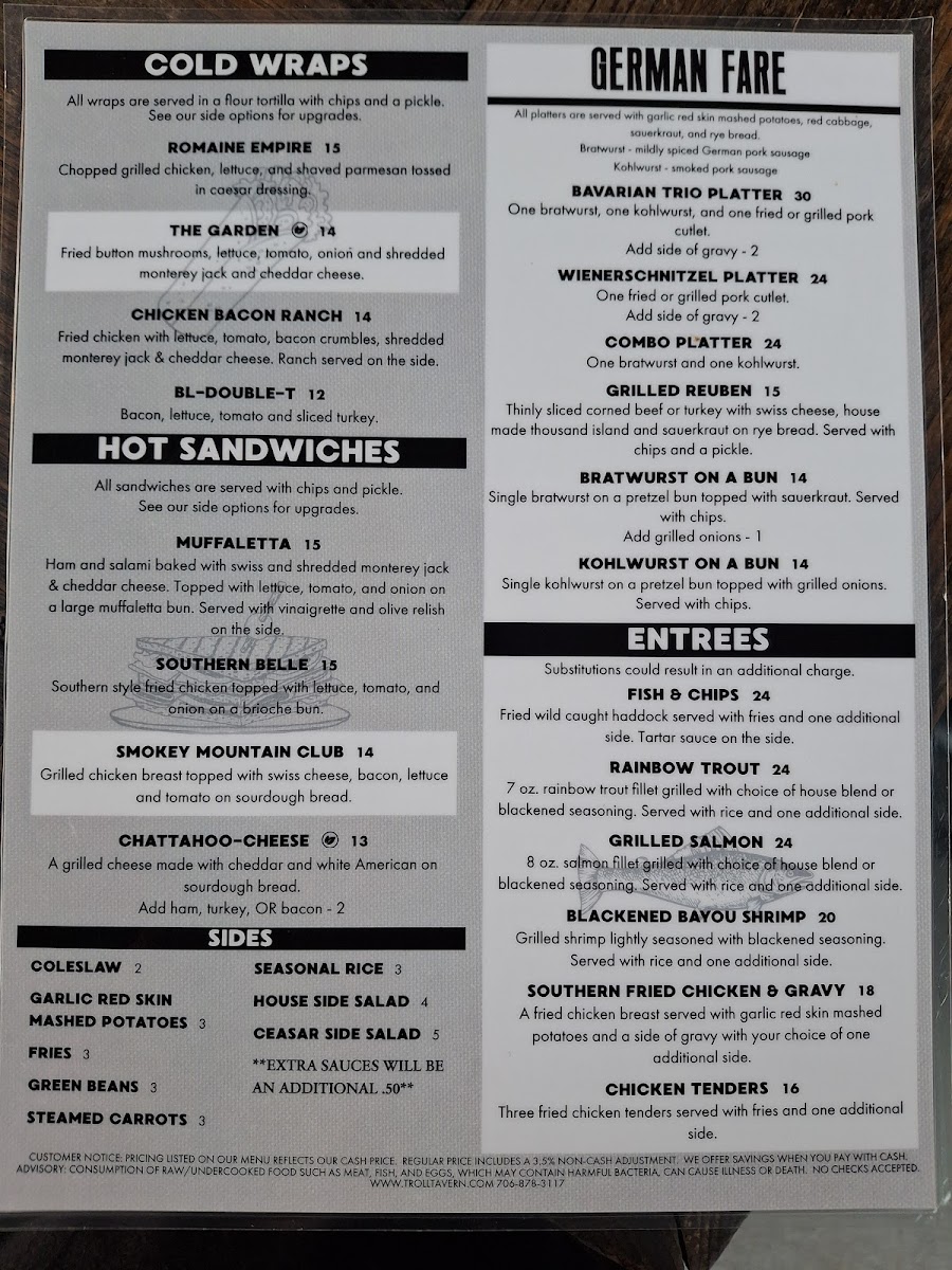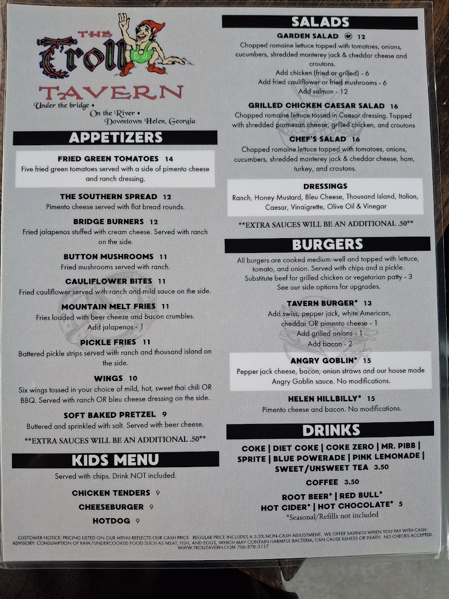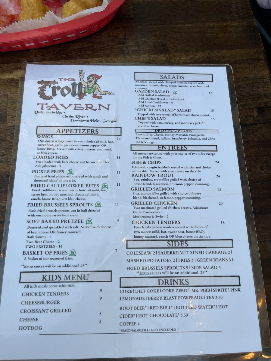 At The Troll Tavern Menu, you'll find a variety of delicious dishes that are perfect for any occasion. Located at 8590 N Main St in Helen, GA, this charming spot offers everything from hearty comfort food to lighter bites, making it an ideal choice for both locals and visitors alike. Whether you're in the mood for a juicy burger, a flavorful steak, or a fresh salad, the menu caters to all tastes. There’s something for everyone, from appetizers that pack a punch to decadent desserts that will leave you craving more. With its warm atmosphere and friendly service, The Troll Tavern is the perfect place to unwind and enjoy great food with friends or family. Every dish is made with care, ensuring that each bite is full of flavor and satisfaction. So next time you’re in Helen, GA, make sure to stop by and explore the menu!