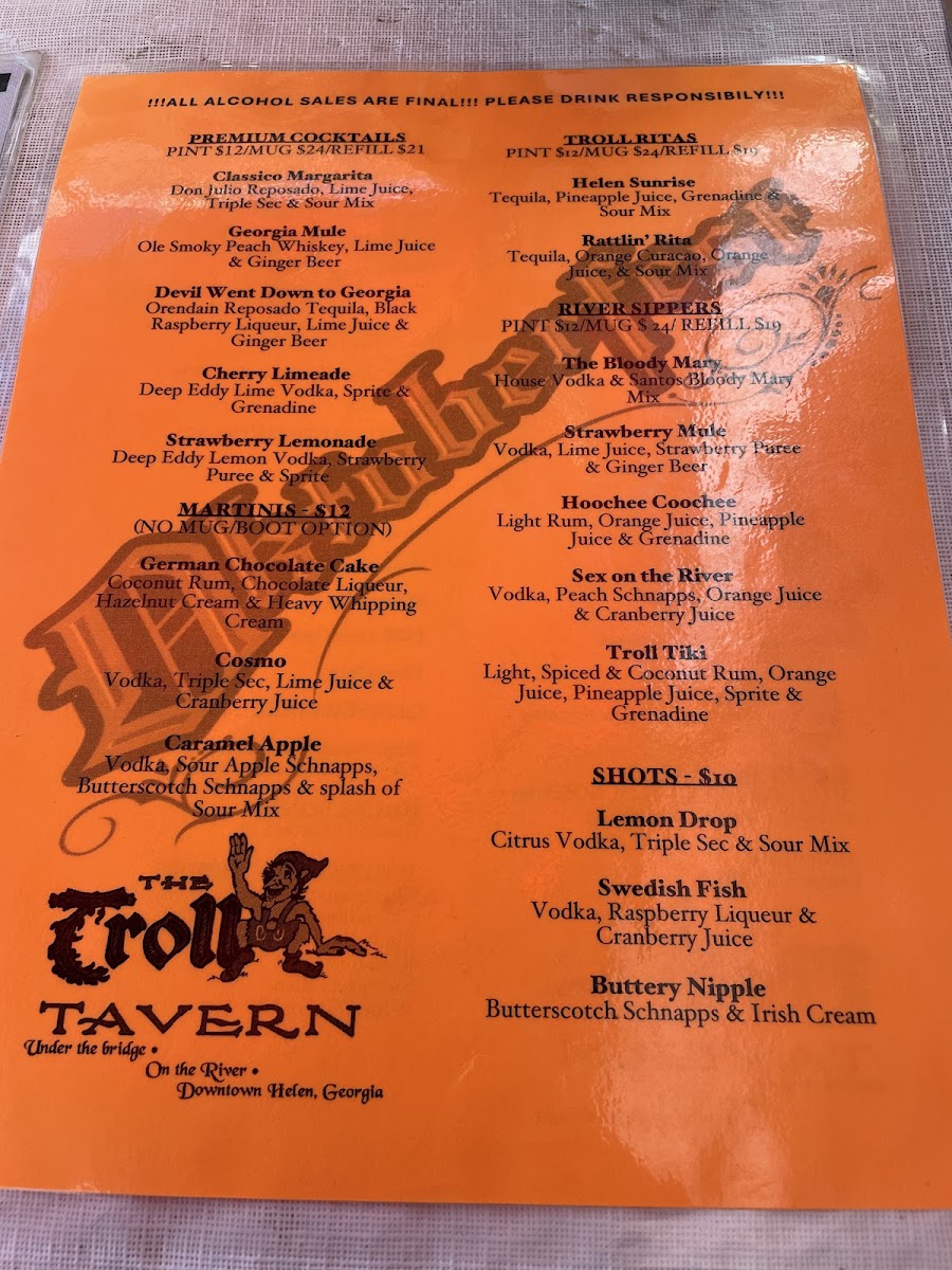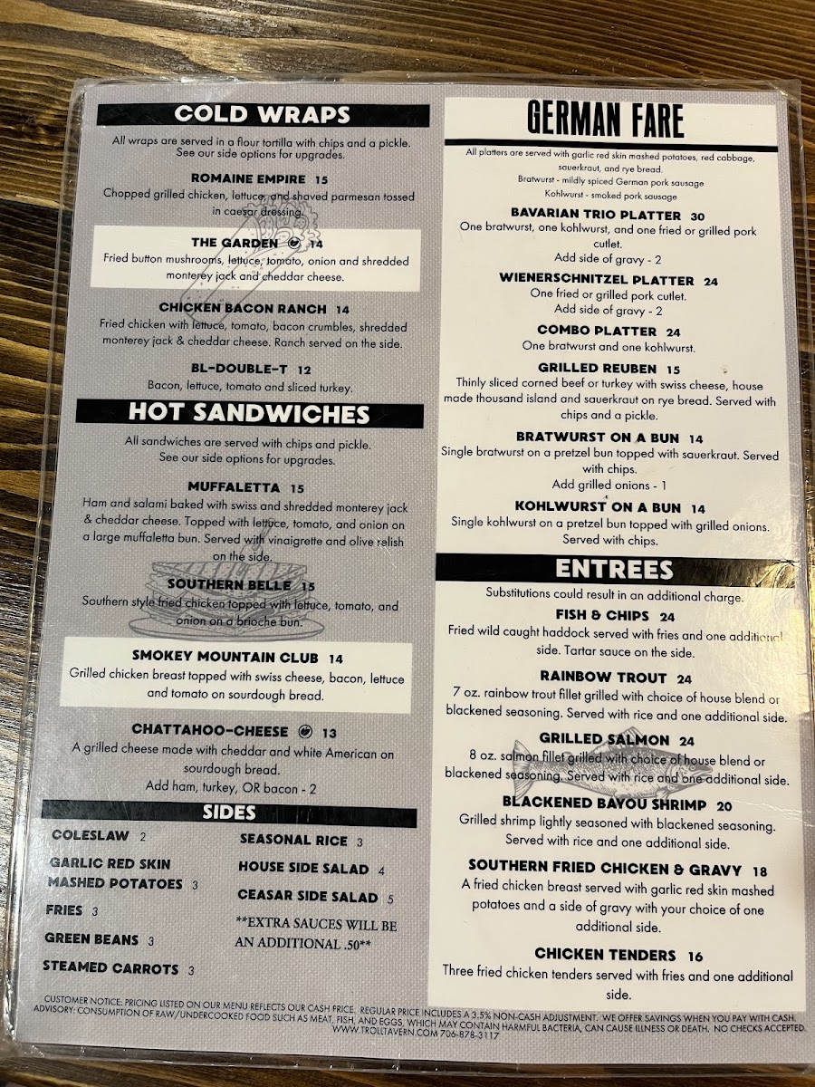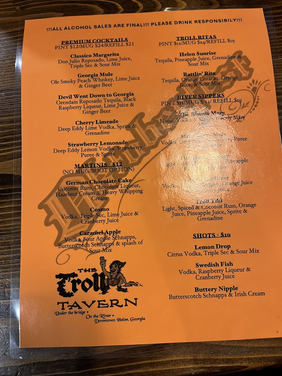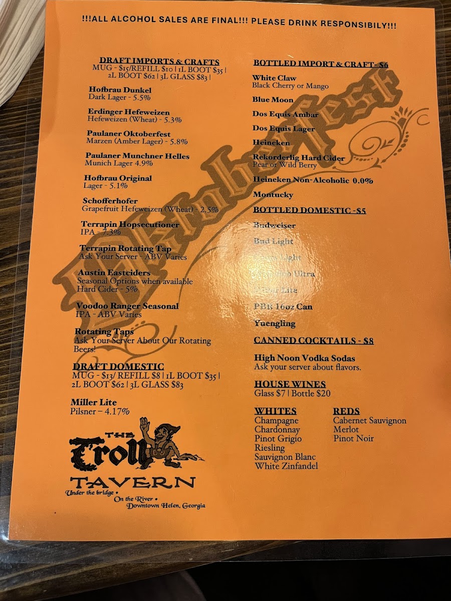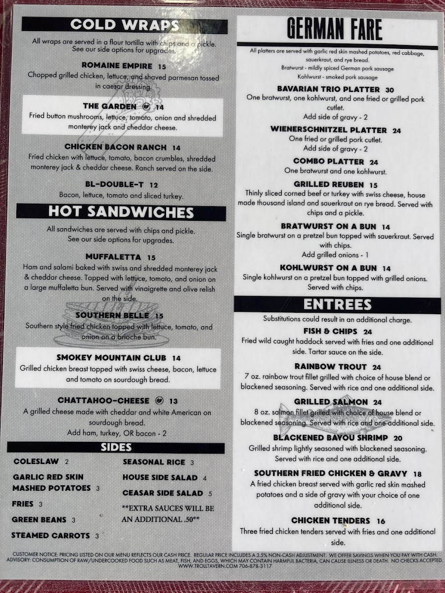 At The Troll Tavern Menu, you'll find a variety of delicious dishes that are perfect for any occasion. Located at 8590 N Main St in Helen, GA, this charming spot offers everything from hearty comfort food to lighter bites, making it an ideal choice for both locals and visitors alike. Whether you're in the mood for a juicy burger, a flavorful steak, or a fresh salad, the menu caters to all tastes. There’s something for everyone, from appetizers that pack a punch to decadent desserts that will leave you craving more. With its warm atmosphere and friendly service, The Troll Tavern is the perfect place to unwind and enjoy great food with friends or family. Every dish is made with care, ensuring that each bite is full of flavor and satisfaction. So next time you’re in Helen, GA, make sure to stop by and explore the menu!